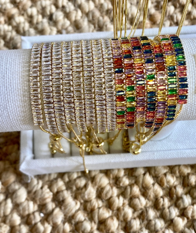 Our top selling adjustable letter bracelet is now available in this tennis style with dazzling Cubic Zirconia charms. Looks chic when work by itself and fun when layered with other bracelets.