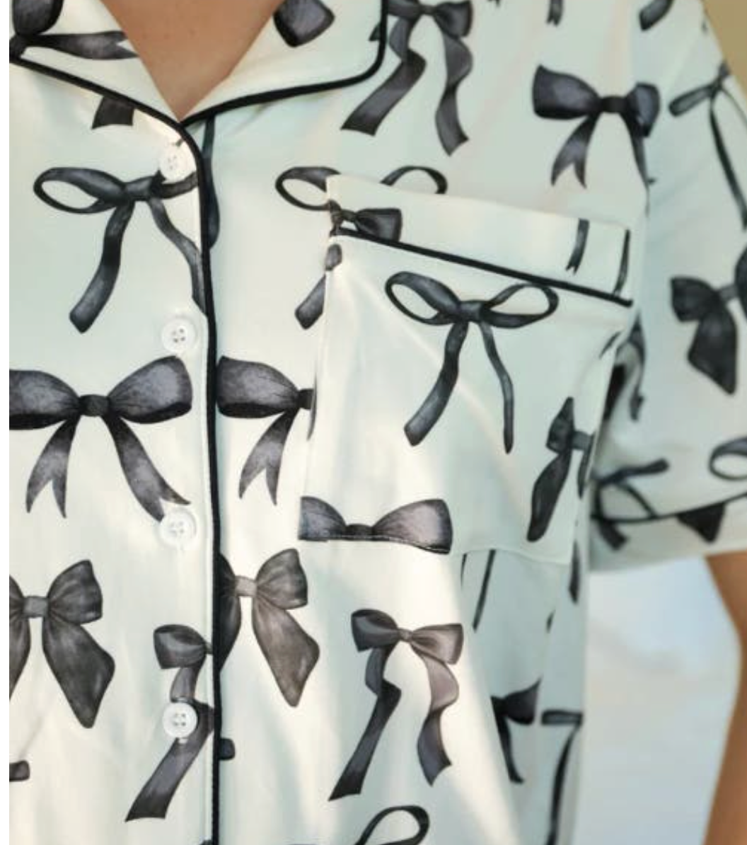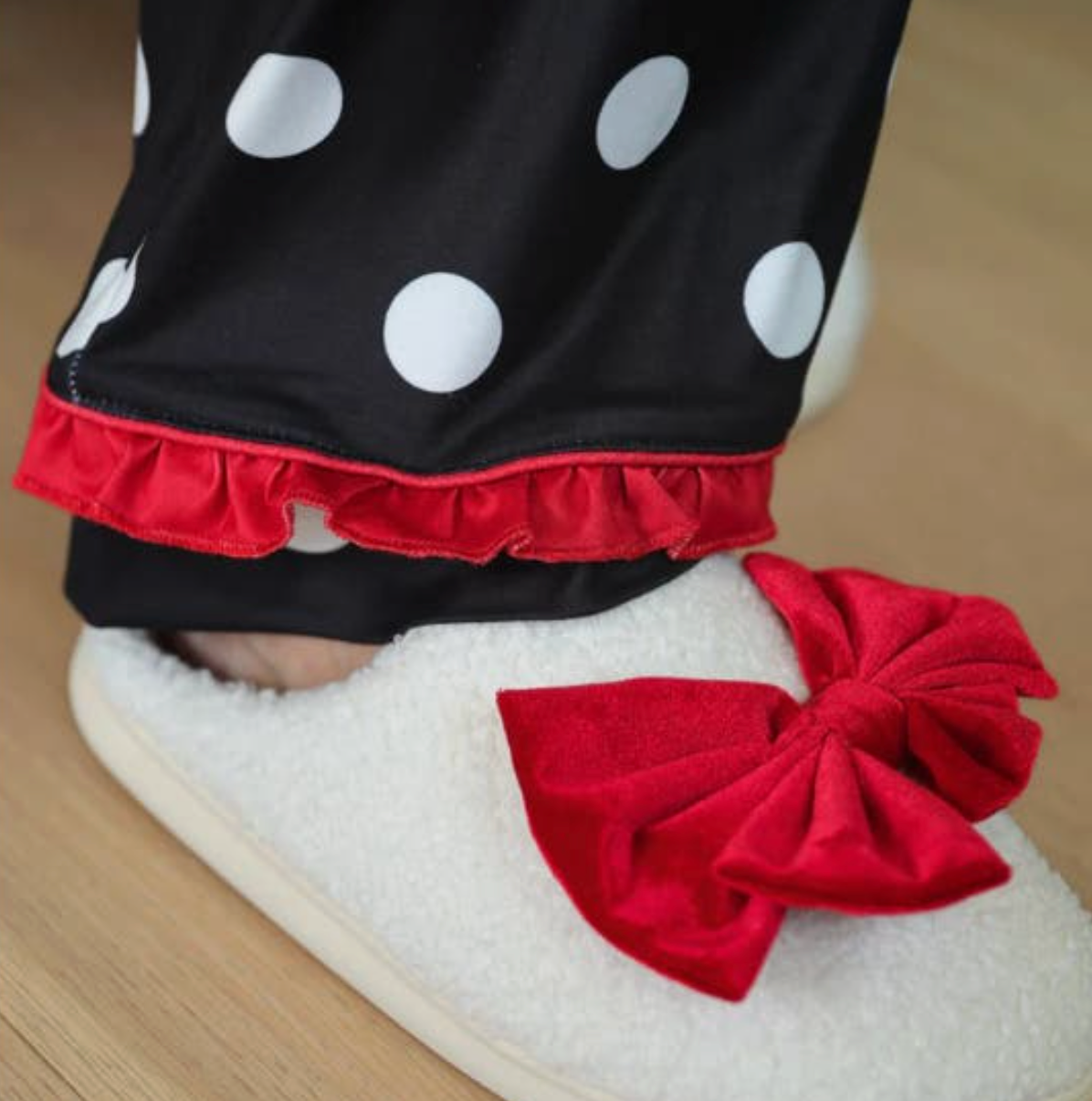 Dotty Darling Polka Dot Ruffle Pajama Set, featuring trendy polka dots, a button-up short sleeve top trimmed with red piping, and black ruffle pants finished with a playful red ruffle and tie. Perfect for a comfy and charming night’s rest!