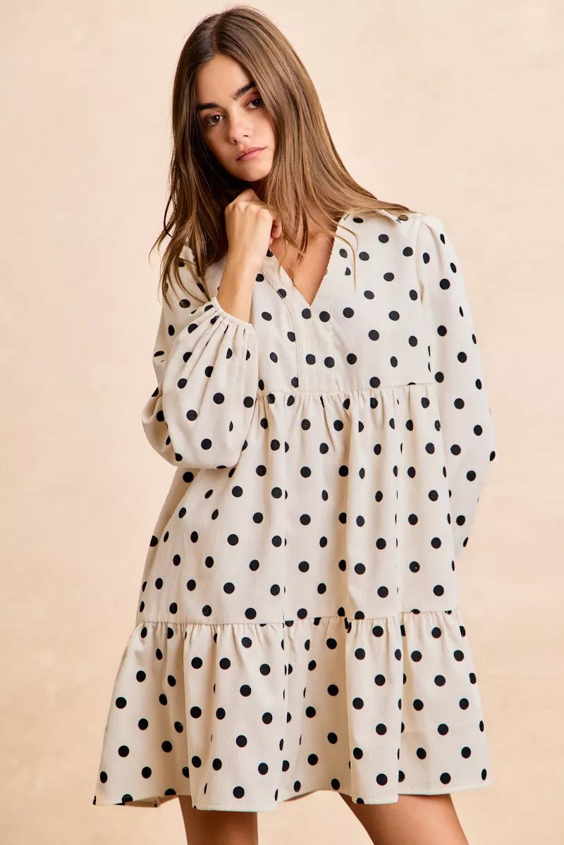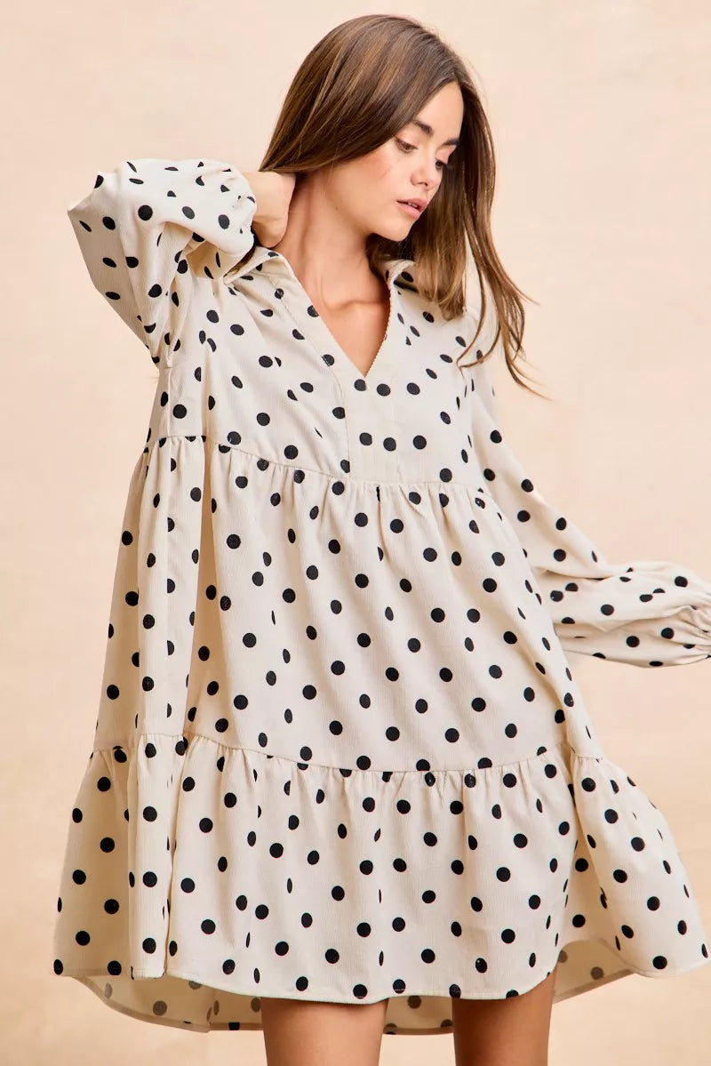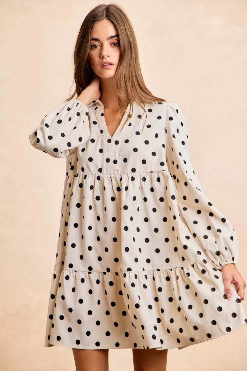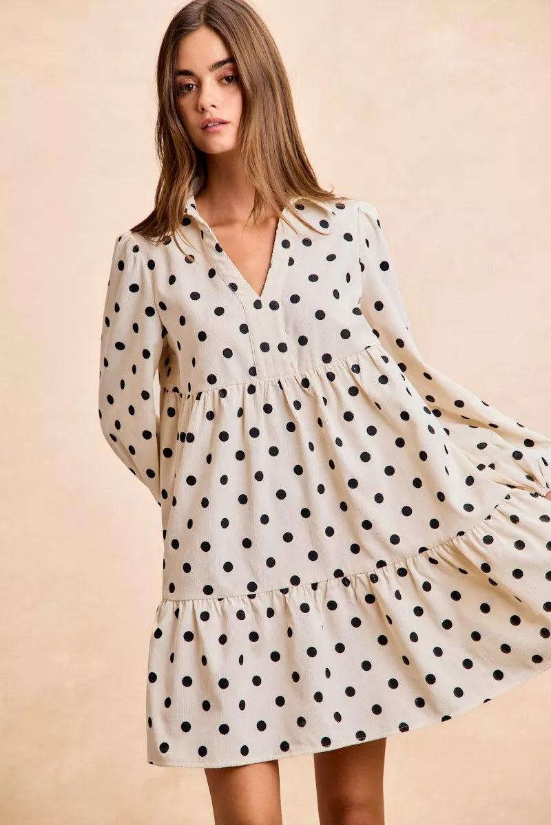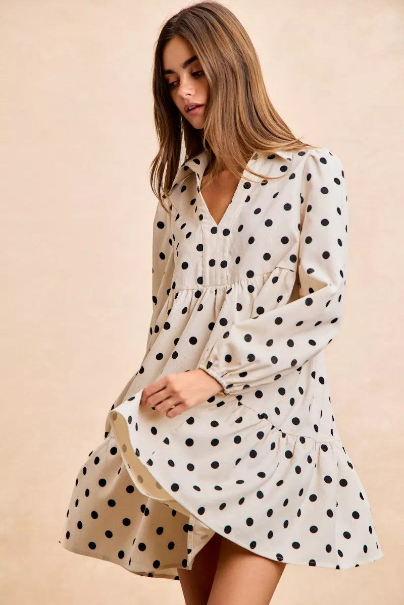 BiBi Polka Dot Corduroy Collared V Neck Dress