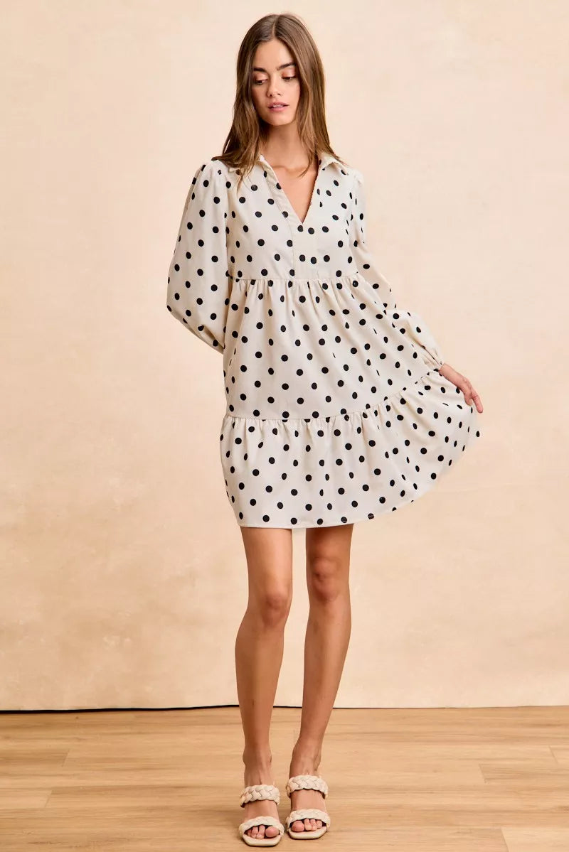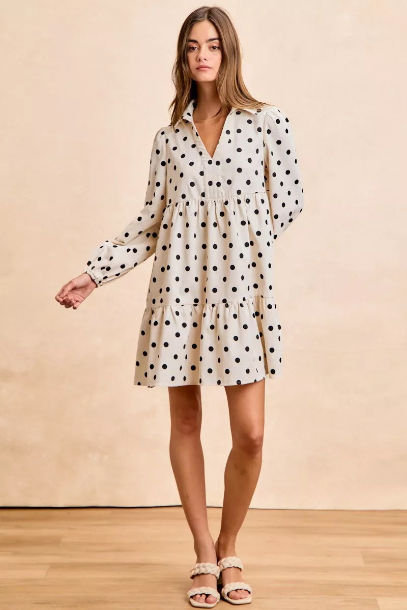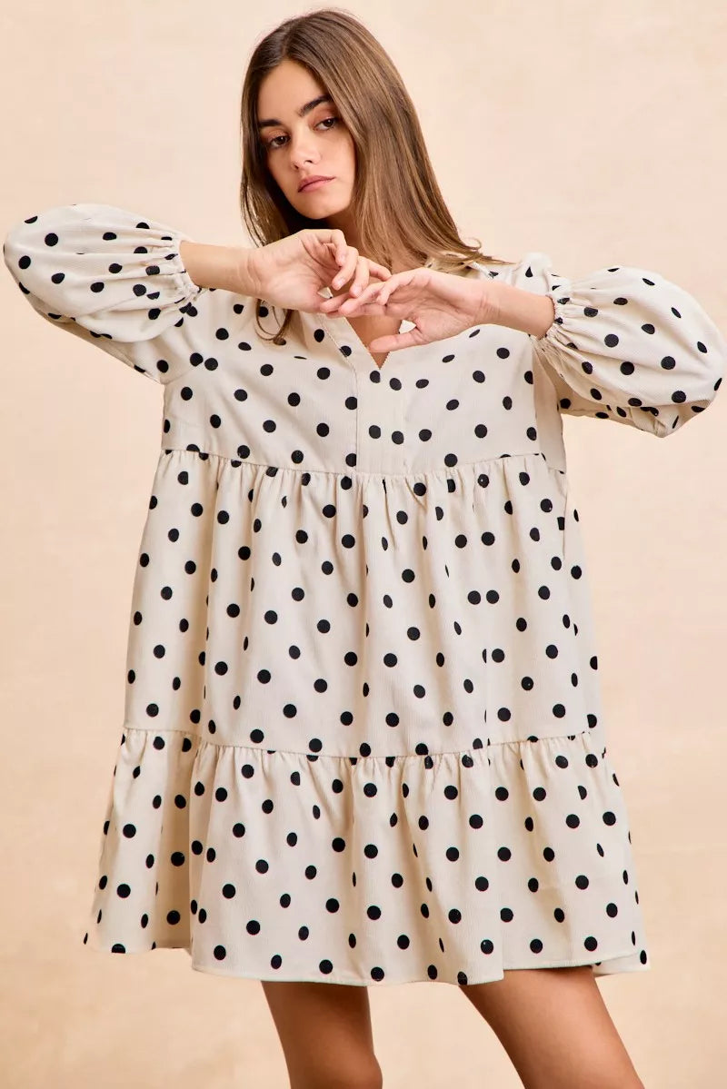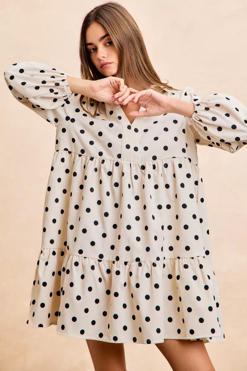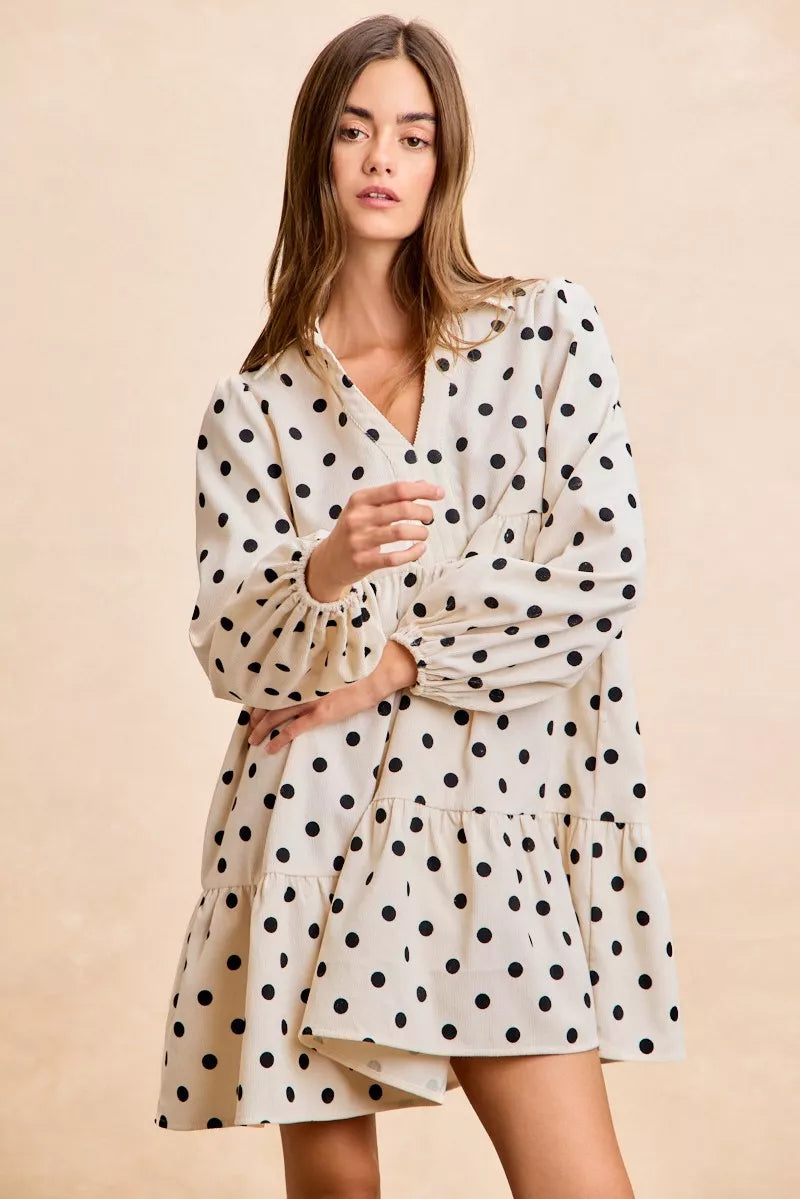 BiBi Polka Dot Corduroy Collared V Neck Dress