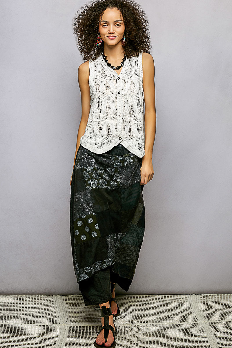 This V-neck sleeveless vest jacket top is crafted in breathable crochet for a lightweight, textured finish. It features a relaxed fit and front button closure for easy, comfortable wear. The V-shaped bottom opening adds a stylish, flattering detail to the silhouette. Designed in a solid color, it offers a clean, versatile look that matches many outfits. Perfect for layering, it elevates casual looks with a boho-chic touch.
